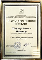 Я был удостоен благодарственного письма от Совета депутатов г. Зеленогорска за весомый вклад в развитие гражданского общества города Зеленогорска.